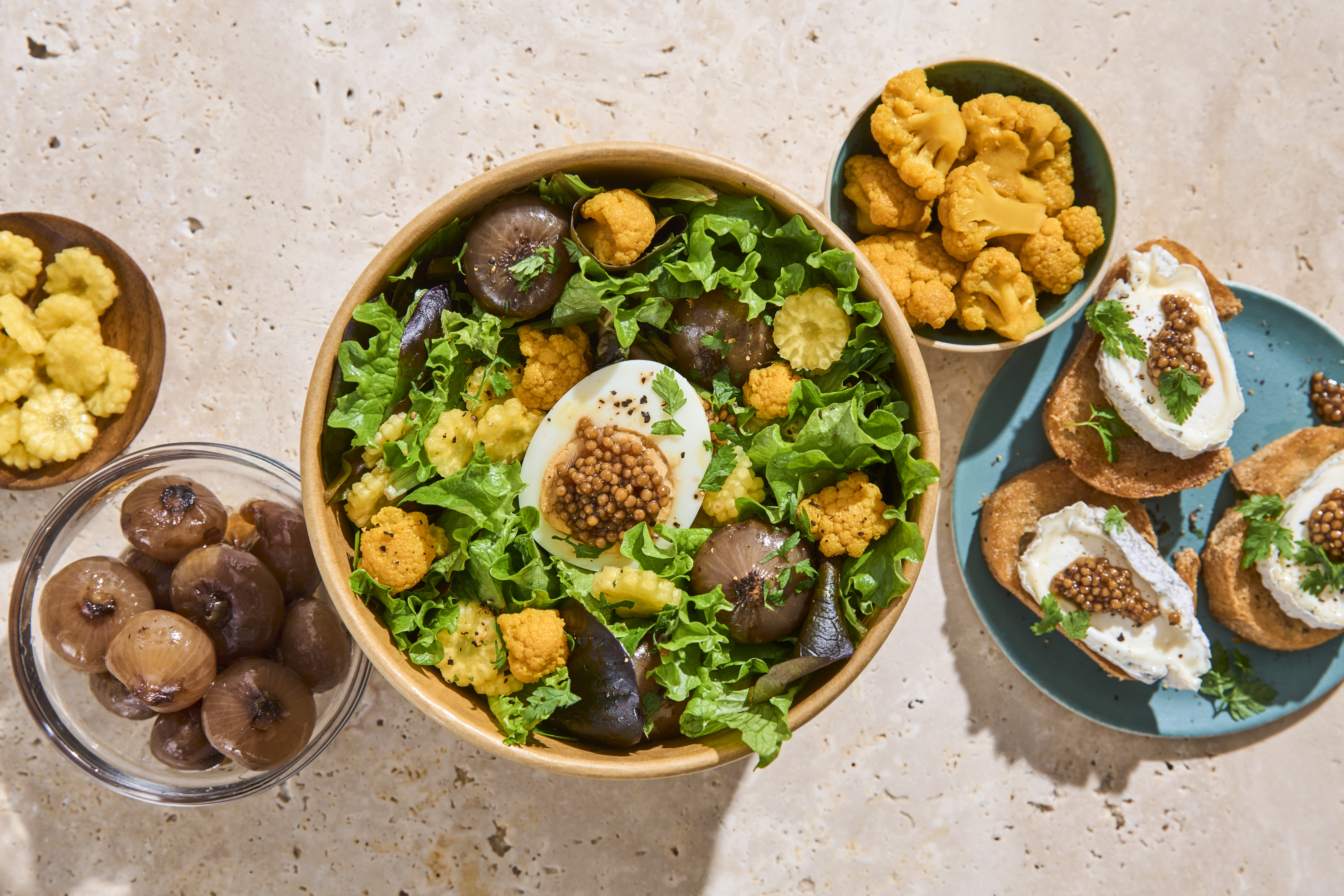 6) Déposer les toasts de chèvre cendré à côté ou directement sur la salade et les garnir de pickles de graines de moutarde.